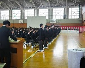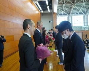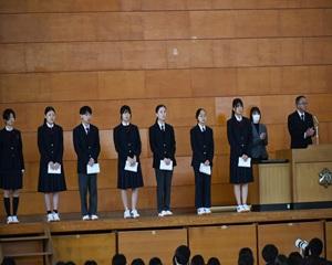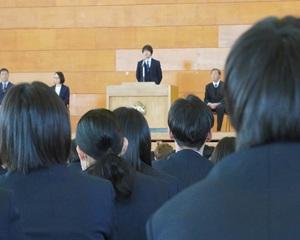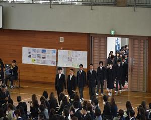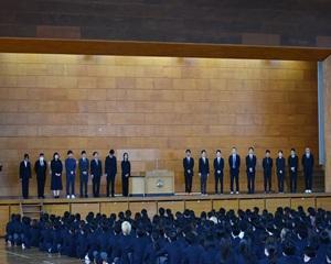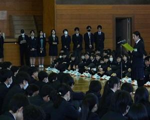 先生方からは本校での思い出や生徒たちへの激励のメッセージを話していただきました。花束贈呈の後、離任される先生方にとっては最後となる校歌を斉唱し、惜しまれつつ本校を去られました。