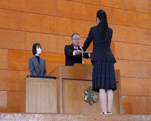 まずは新任式が行われ、新たに本校へ着任した先生方を迎えました。続く生徒会役員認証式もでは、新役員一人ひとりに認証状が手渡されました。学校の新たなリーダーたちの活躍に期待が高まります。始業式では、校長とキャリアサポート部長より講話があり、生徒たちは真剣な眼差しで耳を傾けていました。